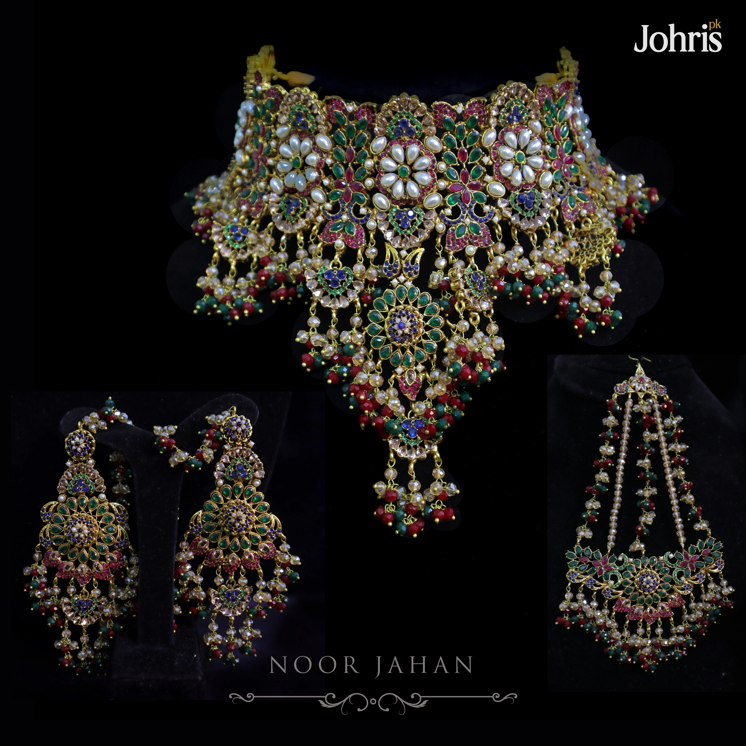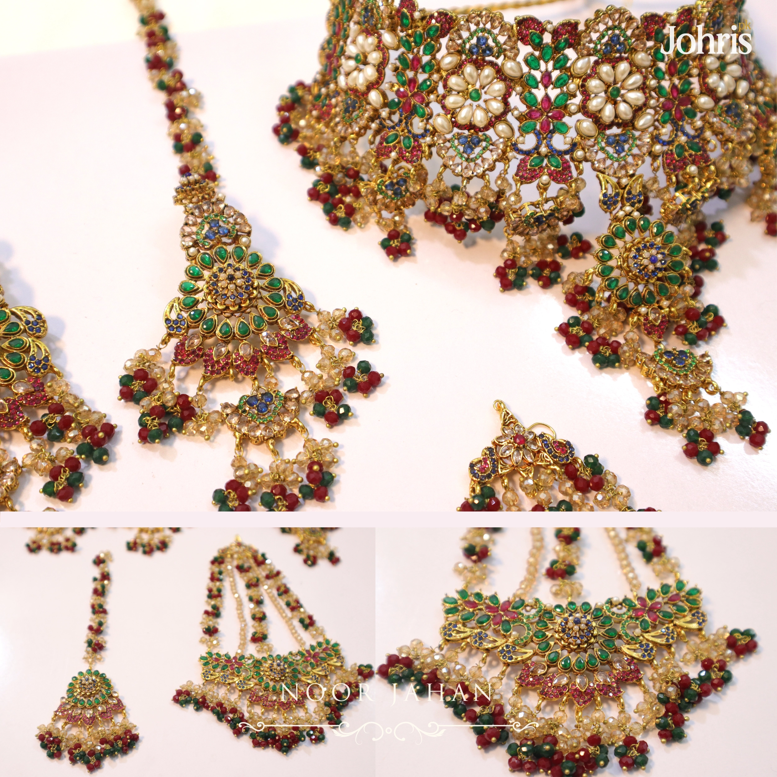 • RoseGold-tone polish Choker Bridal Set with Jhumar, Earrings and Teeka • Floral motifs with multi-color zircon detailing • Pearl accents with ruby and emerald bead drops • Ideal for bridal, barat, and formal wear